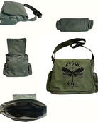 This Canvas Tote combines vintage military green canvas with a striking dragonfly and bohemian-inspired Gypsy Soul print. Featuring a large, durable design with golden-tone hardware, a secure zipper closure, and an adjustable strap, it offers both style and practicality. Perfect for travel or daily use, this spacious crossbody bag lets you carry essentials comfortably while showcasing your unique, free-spirited style.
