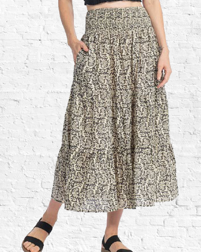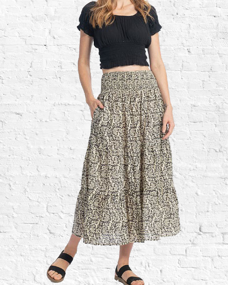 The Organic Cotton Ariel Skirt is the perfect blend of comfort and style. Made with 100% cotton cambric fabric, this best-selling skirt gets softer with each wash. The 6" elastic smocked waistband and three-tier skirt provide a comfortable fit, while the side seam pockets offer convenience. A must-have for any wardrobe!