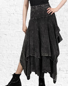 - Elastic waistband at the back, asymmetrical handkerchief hem, layered effect, hand-printed sacred symbols