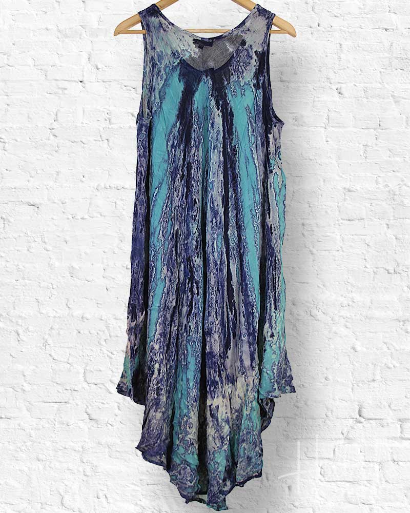 This lightweight, breathable A-line dress features a scoop neck and falls to mid-calf, with sides that rise slightly. Made from 100% natural fibre rayon (derived from wood pulp, with no synthetics), this dress is ethically produced in India. It is designed to fit most body types and accommodates sizes from 90 to 180 lbs.