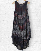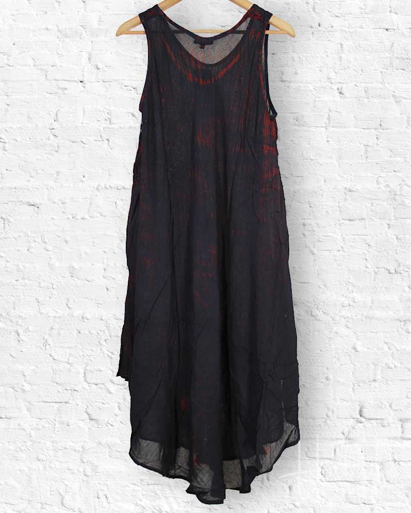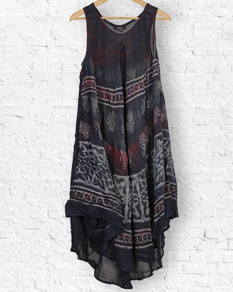 This lightweight, breathable A-line dress features a scoop neck and falls to mid-calf, with sides that rise slightly. Made from 100% natural fibre rayon (derived from wood pulp, with no synthetics), this dress is ethically produced in India. It is designed to fit most body types and accommodates sizes from 90 to 180 lbs.