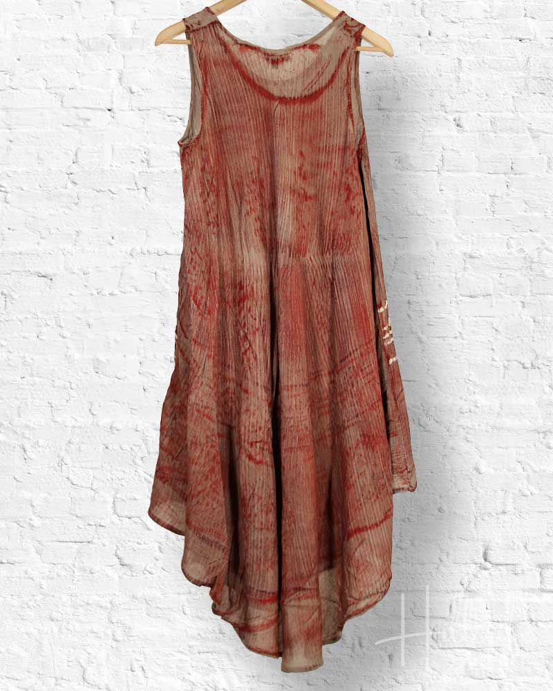 This lightweight, breathable A-line dress features a scoop neck and falls to mid-calf, with sides that rise slightly. Made from 100% natural fibre rayon (derived from wood pulp, with no synthetics), this dress is ethically produced in India. It is designed to fit most body types and accommodates sizes from 90 to 180 lbs.