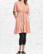 This Ibiza Dress flows gracefully in turquoise and gold, made from super-soft 100% rayon that drapes beautifully on the body. Features a flattering cross-front design and breezy flutter sleeves for easy movement. The elastic waist with tassel drawstring offers adjustable comfort, while the playful ruffle hem adds a touch of charm. Best of all, it includes practical pockets for your small essentials.