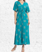 Indulge in the luxurious softness of our Romance Dress in Teal Gold. Made from 100% rayon crepe fabric, it features a v-neck, flutter half sleeves, and an elastic shirring waist with a front tie and tassels. With pockets, ankle length and a front slit, this dress is both elegant and functional.
