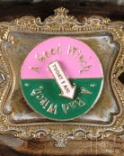 Let this playful enamel and alloy spinning pin badge decide your vibe. Featuring bold green, pink, and white details, it invites you to choose: Good Witch, Bad Witch, or somewhere in between—a perfect accessory to express your ever-changing mood with fun and flair.