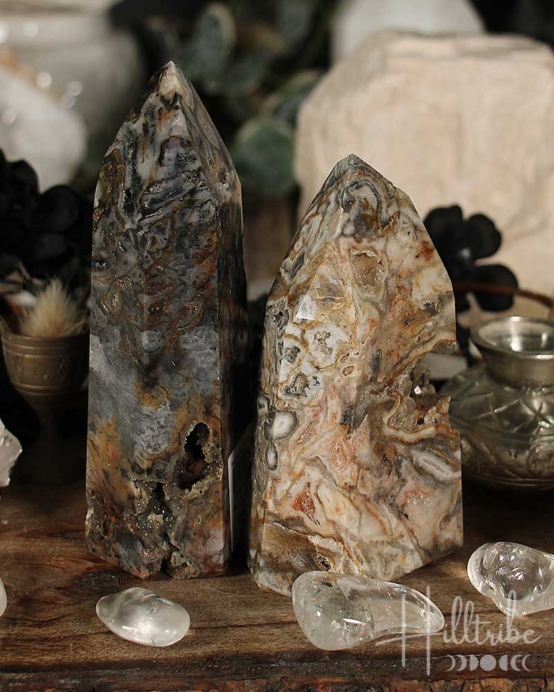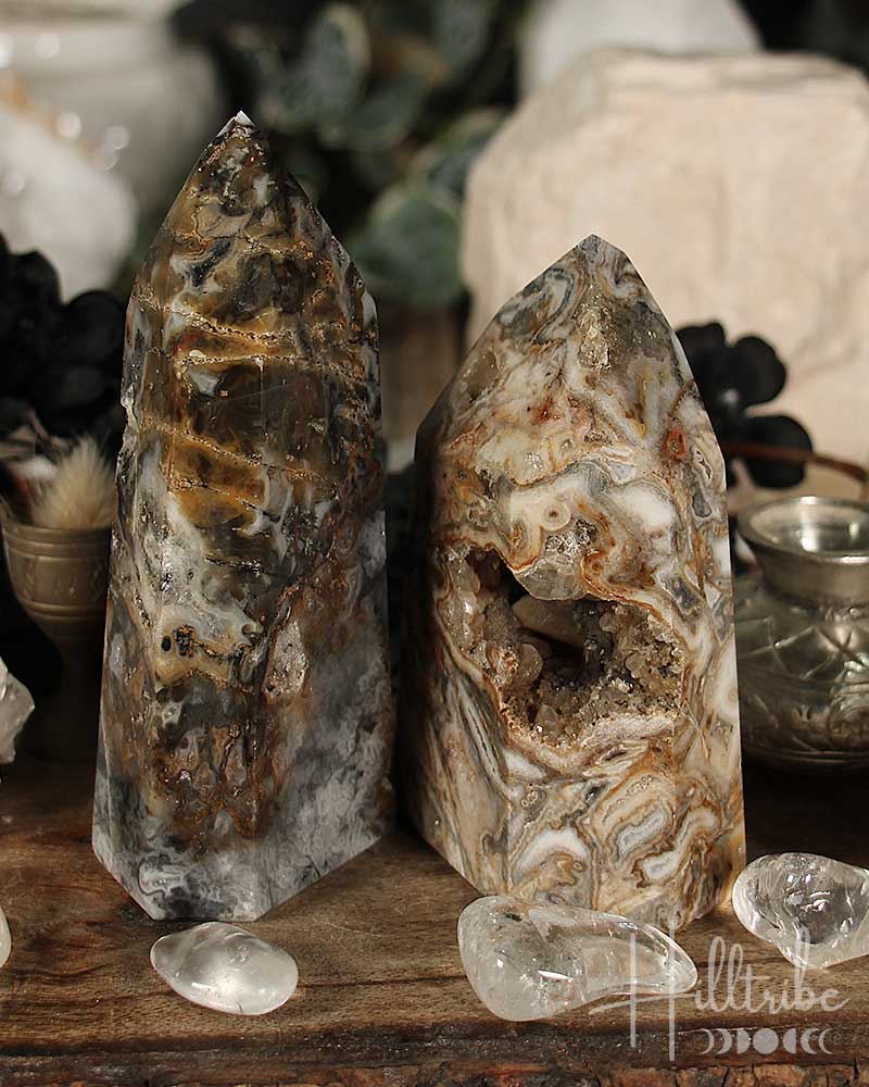 Polished mosaic chalcedony points from Brazil are six-sided, and their natural shape has been polished. Crystal points are often used for channelling energy and creating a peaceful, harmonious environment.