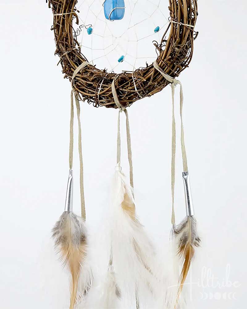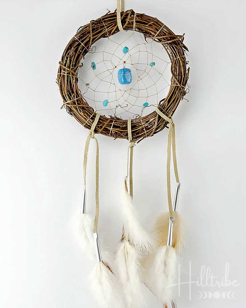 Discover a stunning 6-inch wide dreamcatcher, meticulously handcrafted from an intricate arrangement of small twigs. This enchanting piece is adorned with vibrant Turquenite (dyed Howlite) beads and delicately accented by soft white feathers that sway gently in the breeze.