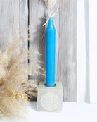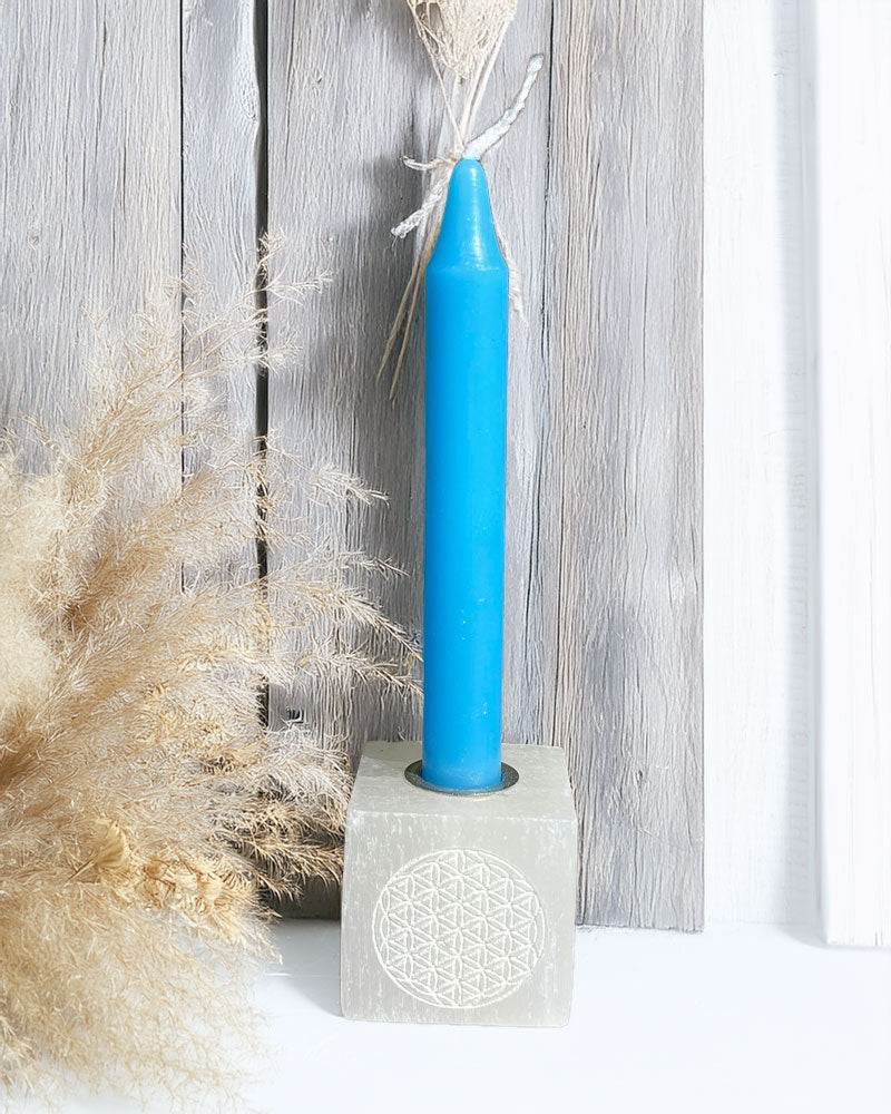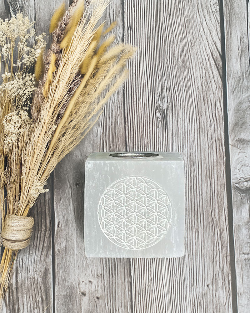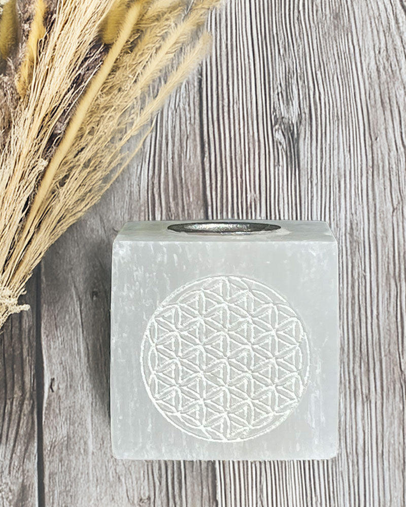 Add a touch of elegance to your sacred space or altar with this Selenite Flower of Life mini candle holder, crafted specifically to hold 4" chime candles. Each holder features a unique, polished design with the sacred Flower of Life symbol engraved on the front. Made from high-vibrational Gypsum, also known as Satin Spar, this candle holder brings positive energy and vibrancy to any setting. The intricate Flower of Life pattern represents sacred geometry and promotes unity and cosmic connection.