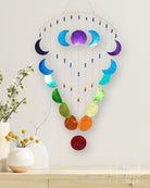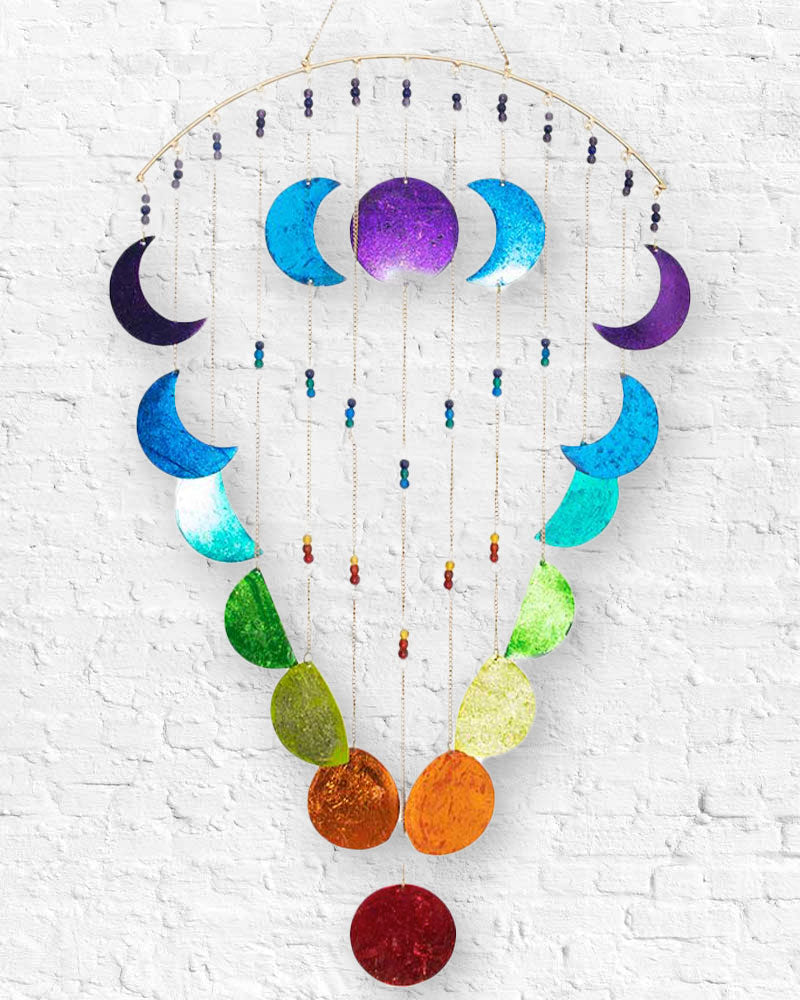 Infuse your space with the calming energy of the ebb and flow of life with our Chakra Moon Phases Mobile Metal. Crafted with an arched gold tone metal, this mobile beautifully displays the lunar cycle and the 7 chakra colors. Glass beads add a touch of sparkle to the dangling moon shapes, while the triple moon design at the center symbolizes the ever-changing cycles of life. Hang it by a window or above your bed for a reminder to reflect, manifest, and align with the natural rhythms of the universe.