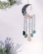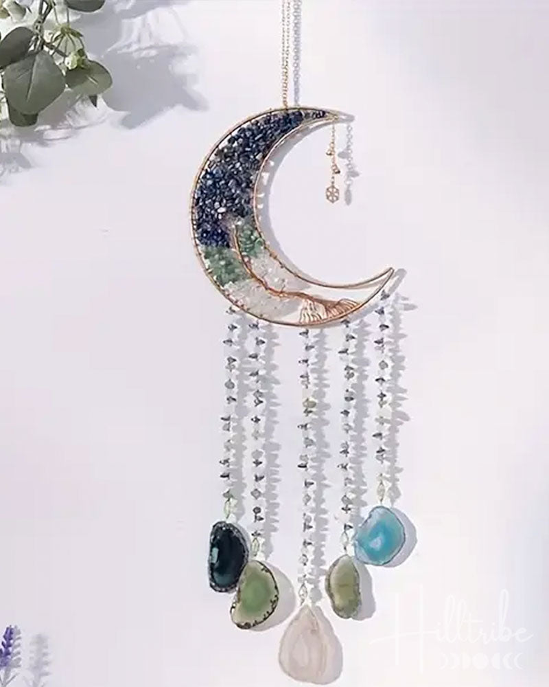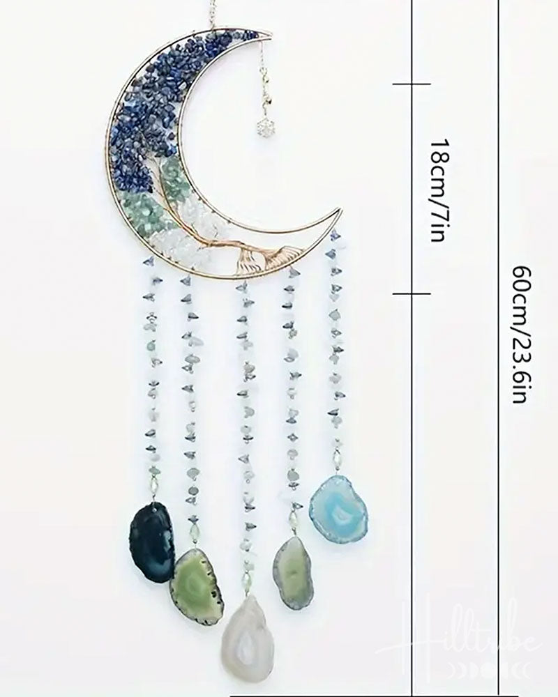 Elevate your space with the Crystal Moon Mobile, a handmade Bohemian dream catcher featuring a delicate Tree of Life design. Adorned with genuine moonstone, turquoise, and smokey quartz, this piece not only adds natural beauty but also promotes balance and positive energy. Perfect for creating a serene atmosphere, it’s a meaningful accent that blends artistry with spiritual harmony.
