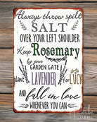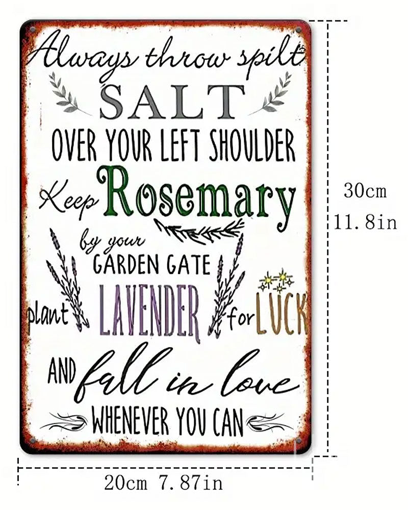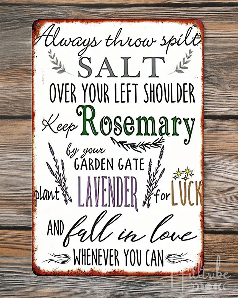 Embrace a timeless superstition with this witch-themed metal sign, featuring the phrase "Always Throw Spilt Salt Over Your Left Shoulder." Inspired by the movie Practical Magic, this rustic lavender and rosemary garden decor reminds you to ward off bad luck by tossing salt over your left shoulder—a gesture believed to blind the devil lurking there. Crafted to add both charm and protection, this sign is a perfect addition to your garden or home, blending folklore with natural beauty for a unique, meaningful touch.