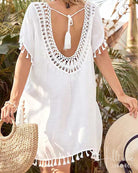 Introducing our delightful crochet cover-up with charming tassels, available in vibrant colours. This stylish bathing suit cover-up is designed to comfortably fit individuals up to 220 lbs. Its dimensions include a bust width of 56 inches and a length of 35 inches. Crafted from a blend of 35% acrylic and 65% cotton, this piece combines comfort and elegance for your beach or poolside outings.
