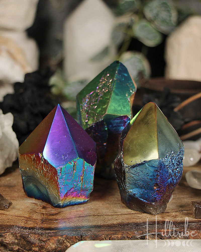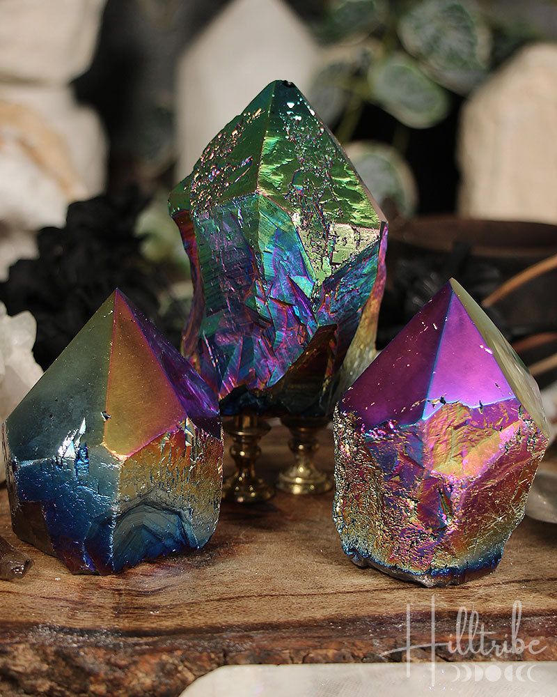 Rainbow (Titanium) Aura Quartz can enhance our aura & activate & open all our Chakras. This excellent crystal allows us to access our Kundalini energy, which charges our body while simultaneously restoring peace & balance to our entire being. It helps individuals find their own inner strength and empowers them to reach their full potential. Titanium Aura Points are ideal for meditation and spiritual healing as they promote peace and serenity, helping to release negative emotions and attachments. Perfect for use in small crystal grids for protection and a stunning decor item.