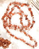 Handmade in India, this beautiful necklace is made from chipped pieces of carnelian and hangs 32” long. A gorgeous piece to wear or wrap around as a bracelet.