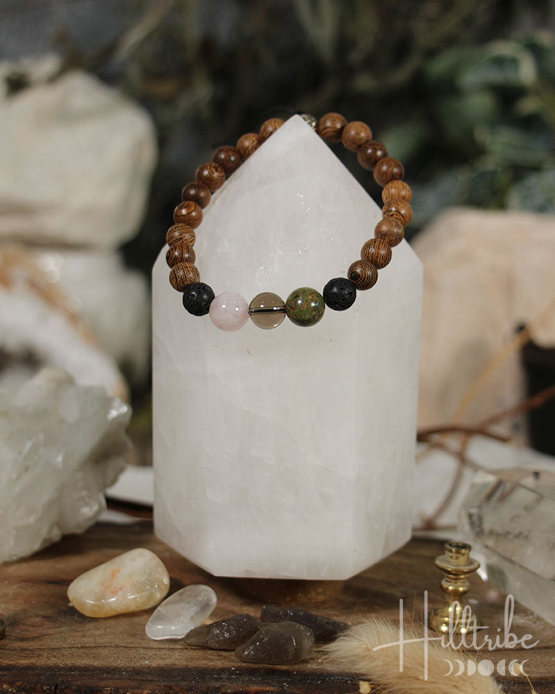 This Spirit Animal Bracelet is lovingly made, incorporating wood beads, 2 lava beads, and 3 powerful healing crystals - Rose Quartz (unconditional love), Charoite (release your fears), Unakite (gentleness)