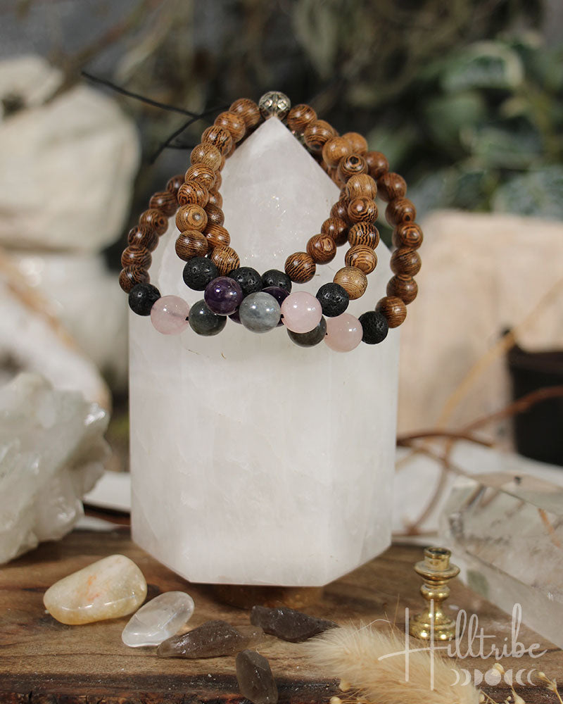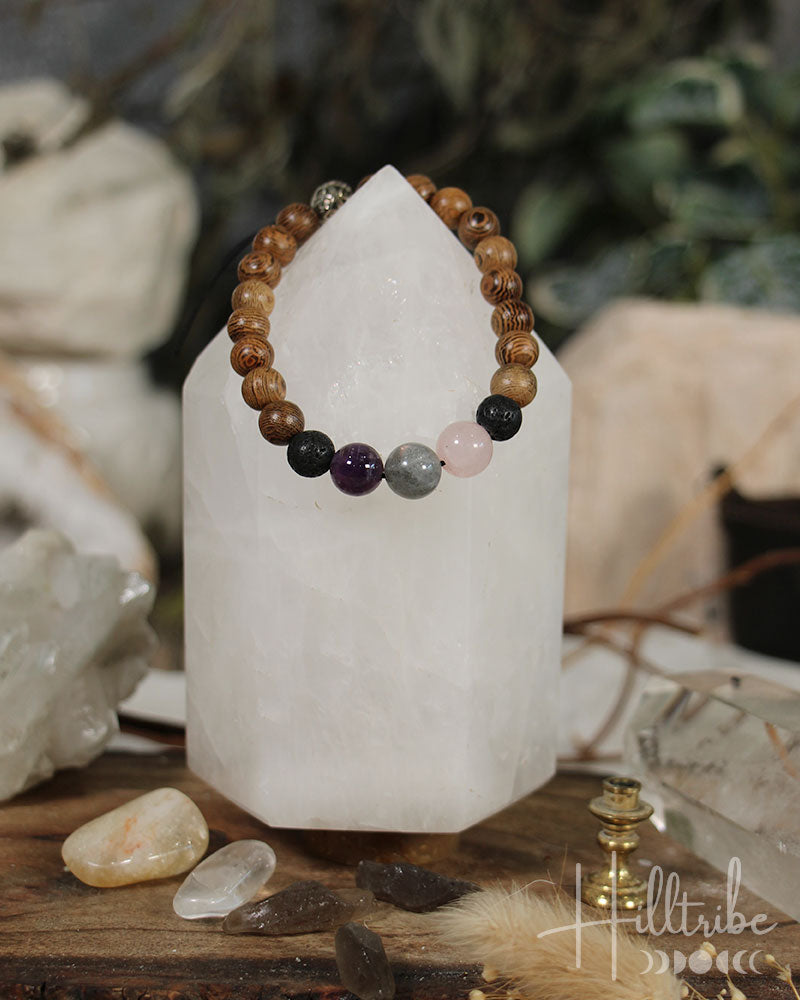 This Spirit Animal Bracelet is lovingly made, incorporating wood beads, 2 lava beads, and 3 powerful healing crystals - Rose Quartz (release stress/find balance), Labradorite (psychic & intuition), Amethyst (record keeping)