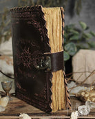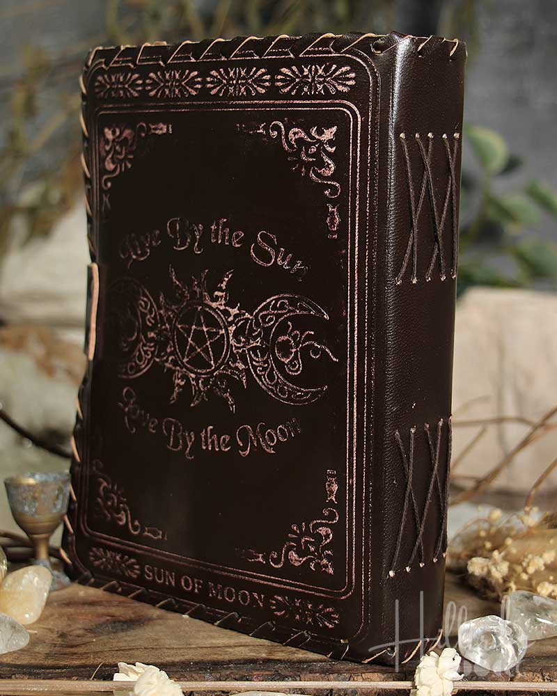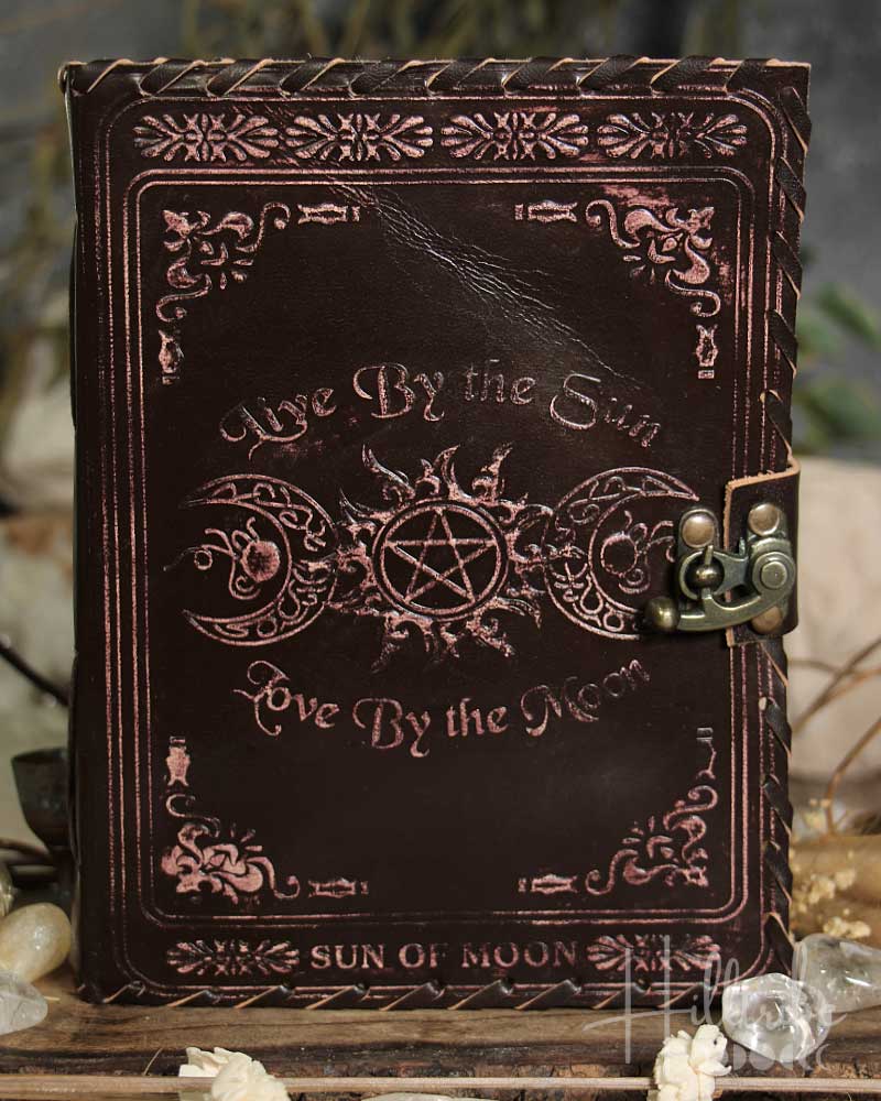 Discover the enchanting wonders of the cosmos: live by the sun and love by the moon. This beautifully embossed journal, adorned with mystical symbols such as the triple moon and the pentacle, invites you to weave your own spells and narratives. Delight in an eco-friendly writing experience with this elegant leather-bound journal, which is handcrafted from recycled materials, reflecting a commitment to fair trade principles. It serves as an ideal companion for journaling, sketching, or capturing your thoughts.