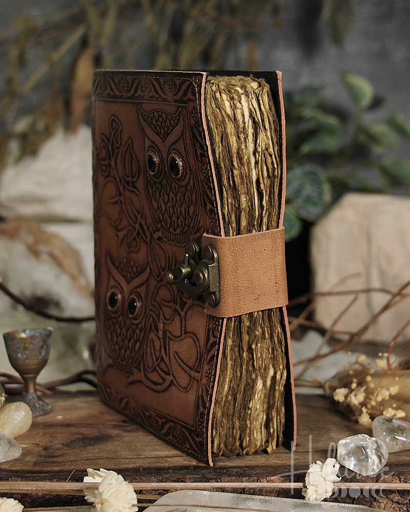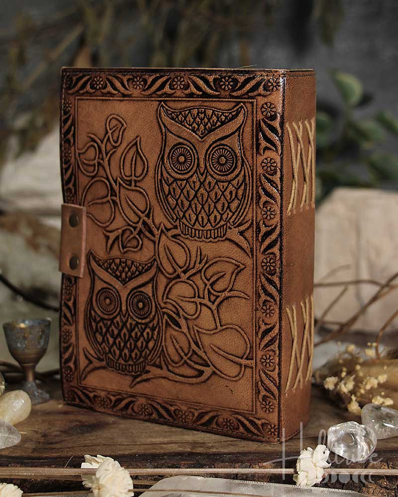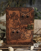Embrace your creativity with our embossed leather journal, adorned with two owls perched on a tree branch. Featuring an antique latch for secure closure, this journal offers an eco-friendly writing experience. Handcrafted from recycled materials, it reflects a commitment to fair trade principles and is perfect for journaling, sketching, or capturing your thoughts.