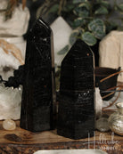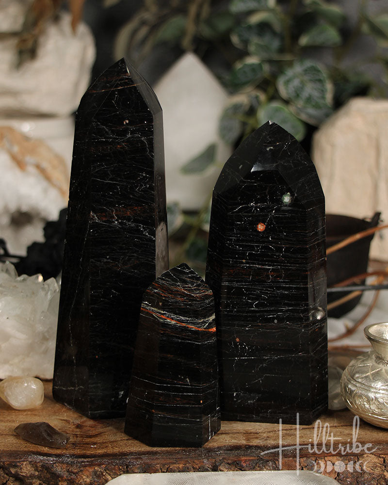 These polished Black Tourmaline crystal points with iron inclusions from Brazil are six-sided, with their natural shape carefully refined to a smooth finish. Crystal points are widely used in healing and spiritual practices, as their tapered apex is believed to direct energy flow with precision.