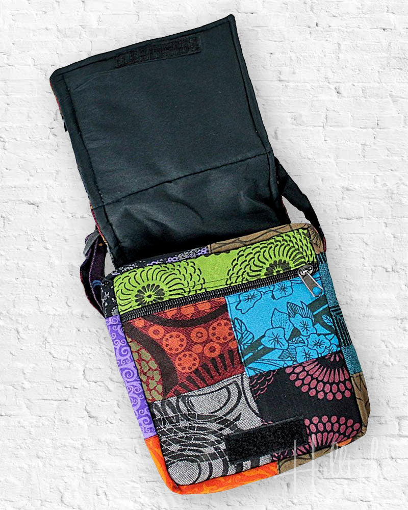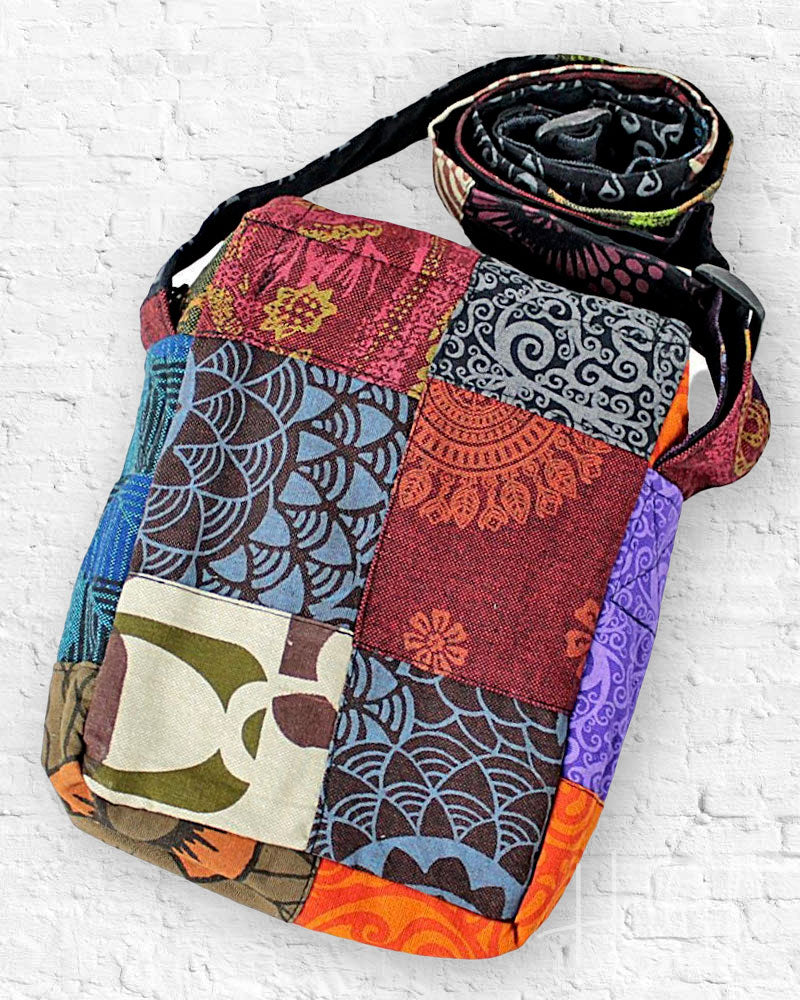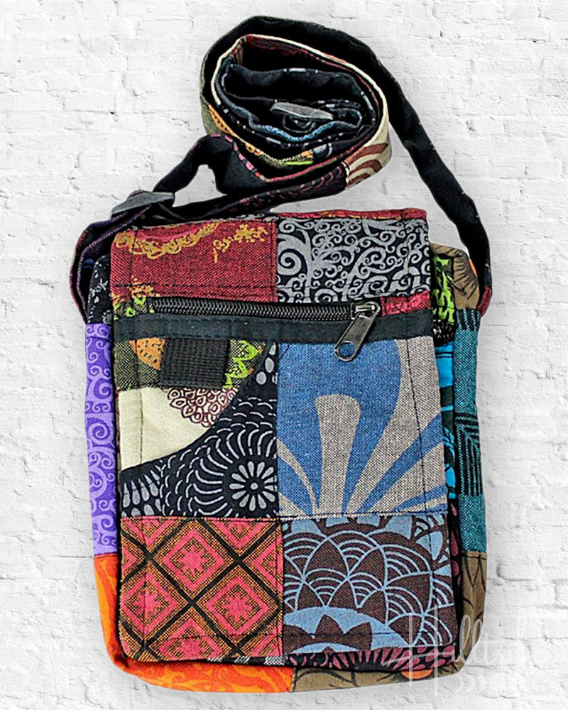 Introducing a compact and stylish crossbody bag that is handcrafted from 100% cotton, featuring vibrant patchwork and hand-printed details. Ethically made in Nepal, this bag offers secure storage with multiple zippered pockets and an adjustable strap for comfortable, hands-free convenience.