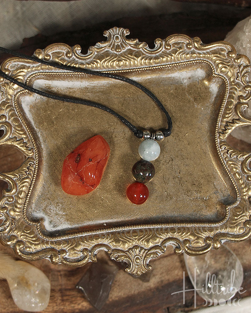Experience courage like never before with our Spell Me necklace. Made with three crystal beads; their calming energies, derived from aquamarine, help reduce stress and soothe fears. Bloodstone teaches courage, and carnelian boosts confidence, making it a powerful tool for facing any challenge.