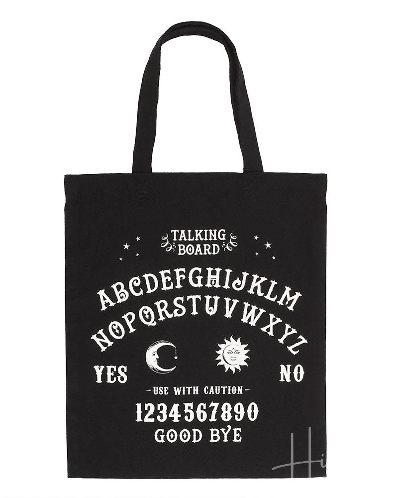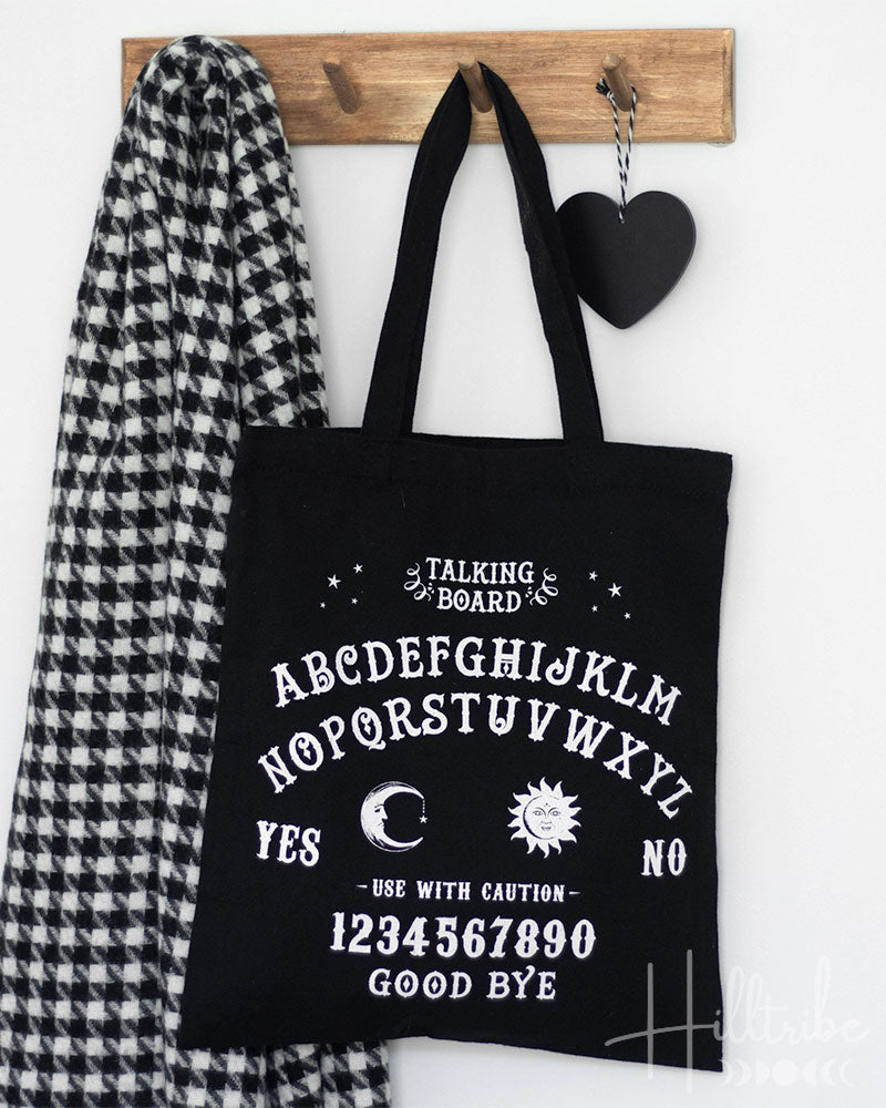 Perfect for doing the weekly shop, carrying library books, holding essentials for short day trips and more, this cotton tote bag makes a great eco-friendly addition to anyone's collection. Features a gothic talking board design printed on black inspired by classic Ouiji boards. 40cm tall, not including handles.