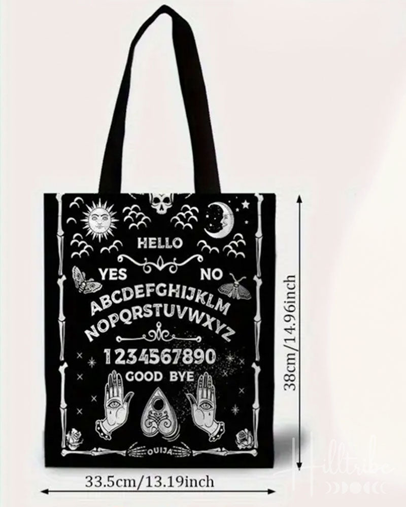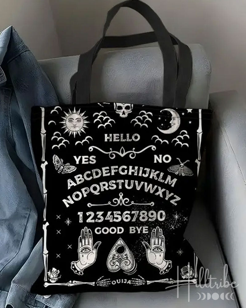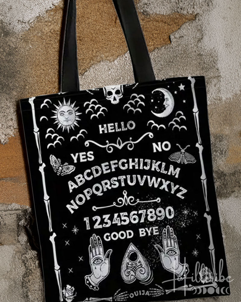 Carry your essentials with a touch of mystique using the Spirit Talking Board Tote Bag. This spacious black tote features a striking white "Hello Yes No Good Bye" Ouija board design on both sides, blending style with intrigue. Its large capacity (13" x 15") and durable construction make it perfect for everyday use, whether you're heading to work, school, or casual outings. Lightweight and portable, this handbag adds a unique flair to your daily routine while keeping your belongings organized and accessible. Embrace the spirit of adventure with this eye-catching, practical tote.