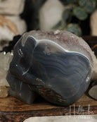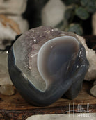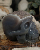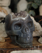 Our natural Amethyst Agate Crystal Skull is a remarkable piece that harmoniously blends the stabilizing properties of agate with the serene energies of amethyst. Each intricately carved skull highlights the unique banding patterns of agate paired with beautiful raw amethyst clusters, ensuring that every piece is truly one-of-a-kind.