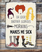 Add a touch of spooky charm to your space with this 12x8 inch Hocus Pocus metal sign. Crafted from tin, it features iconic witch-themed artwork, including broomsticks and boots, paired with the witty phrase, "Oh Look Another Glorious Morning Makes Me Sick." Perfect for Halloween or year-round decor, this durable wall piece brings a blend of humor and nostalgia to any room. Easily display it indoors or outdoors to celebrate the magic of the season with style.
