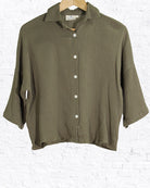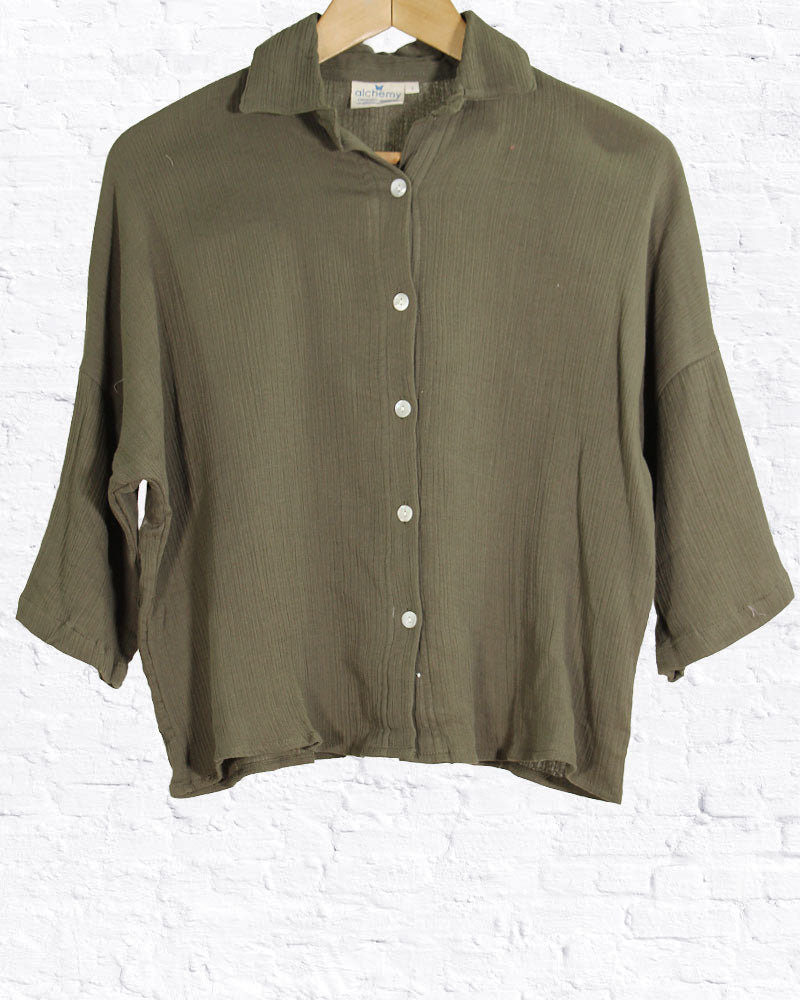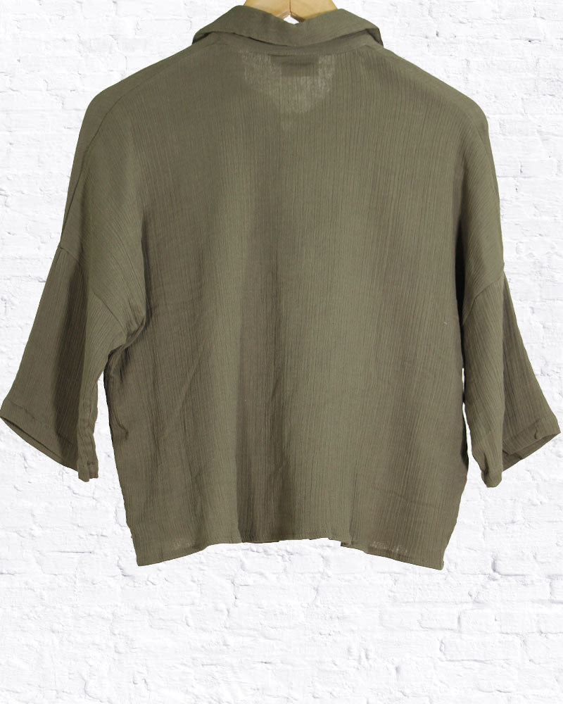 Experience effortless elegance with our Avatar Top. Crafted from premium 100% cotton double-layer gauze for exceptional comfort and breathability. The sophisticated folded collar and 3/4 sleeves create a flattering silhouette, while the pearl buttons add a touch of luxury. Versatile by design, wear it tied for a more defined look that accentuates your figure. Perfect for elevating both casual and semi-formal outfits.