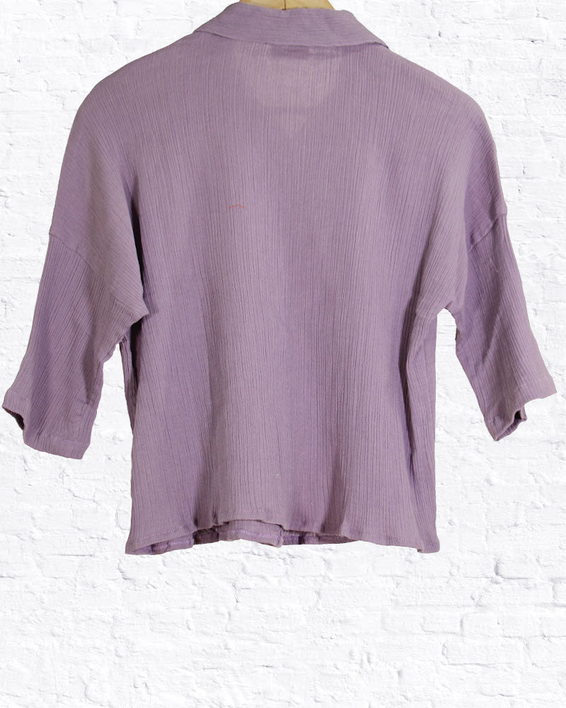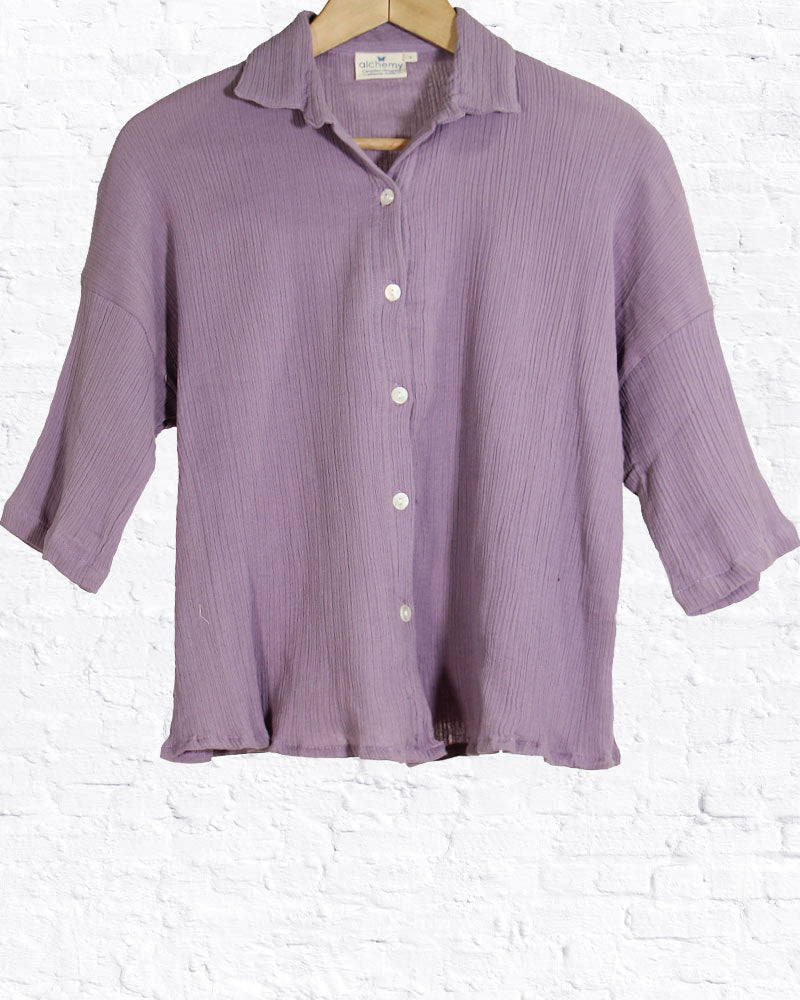 Experience effortless elegance with our Avatar Top. Crafted from premium 100% cotton double-layer gauze for exceptional comfort and breathability. The sophisticated folded collar and 3/4 sleeves create a flattering silhouette, while the pearl buttons add a touch of luxury. Versatile by design, wear it tied for a more defined look that accentuates your figure. Perfect for elevating both casual and semi-formal outfits.
