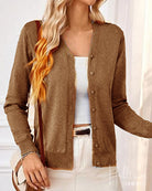 This long sleeve button-up cardigan is a staple for every wardrobe. Made in a solid colour, it offers both classic style and comfortable warmth. The V-neckline gently shapes the neck and shoulders, giving a simple and elegant finish to your outfit.