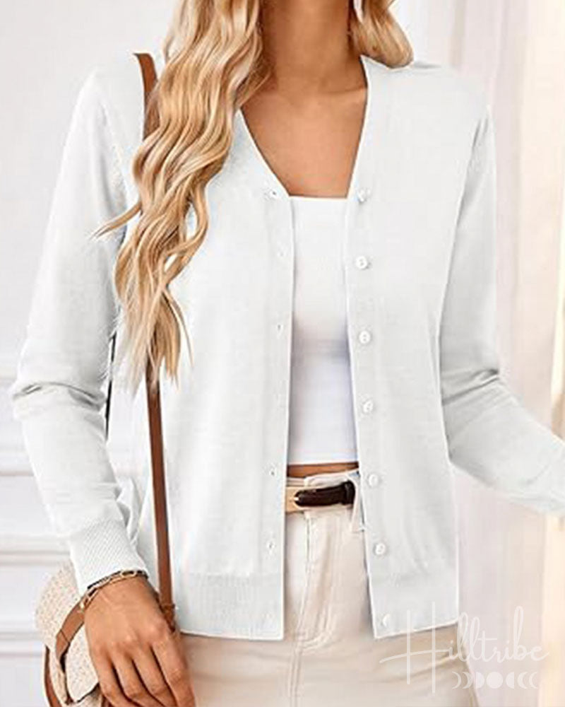 This long sleeve button-up cardigan is a staple for every wardrobe. Made in a solid colour, it offers both classic style and comfortable warmth. The V-neckline gently shapes the neck and shoulders, giving a simple and elegant finish to your outfit.