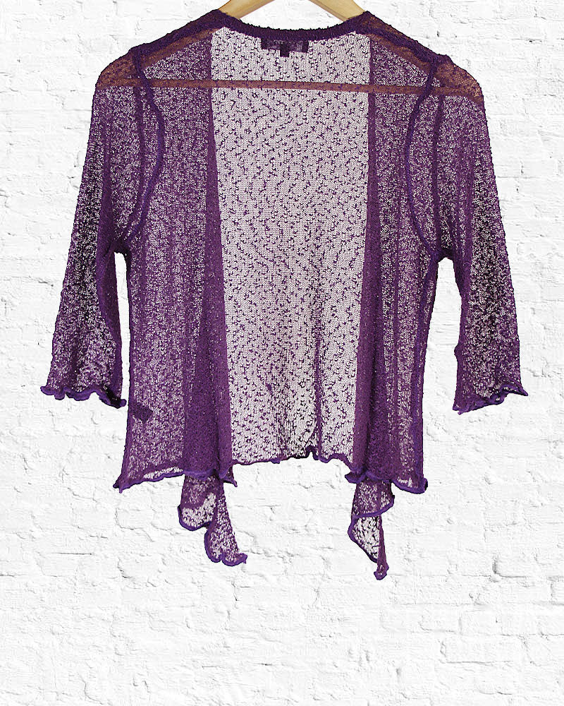 - Light weight mesh, front tie or leave open, 3/4 length sleeve, slight ruffle hemline