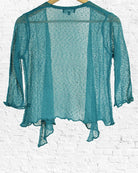 • Light weight mesh, front tie or leave open, 3/4 length sleeve, slight ruffle hemline