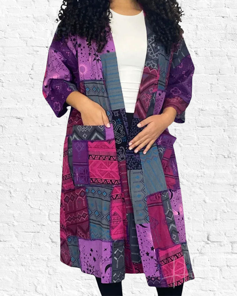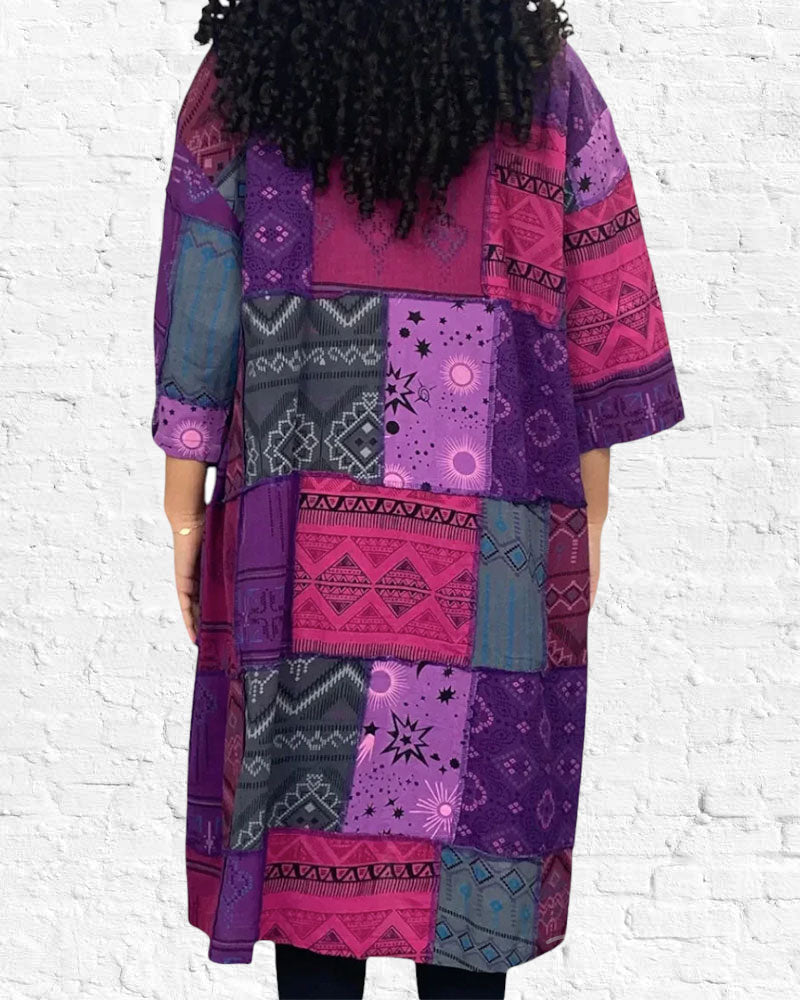 The Zaga Kimono Purple Patch is a beautifully handcrafted piece from Nepal, made with fair-trade cotton. Its rich purple patchwork features detailed geometric and celestial patterns, combining artistry with ethical craftsmanship. Lightweight and breathable, this 100% cotton kimono offers comfort in any season. The relaxed open-front design and roomy front pockets make it both practical and stylish, perfect for adding a natural, boho touch to your wardrobe while supporting Nepalese artisans.