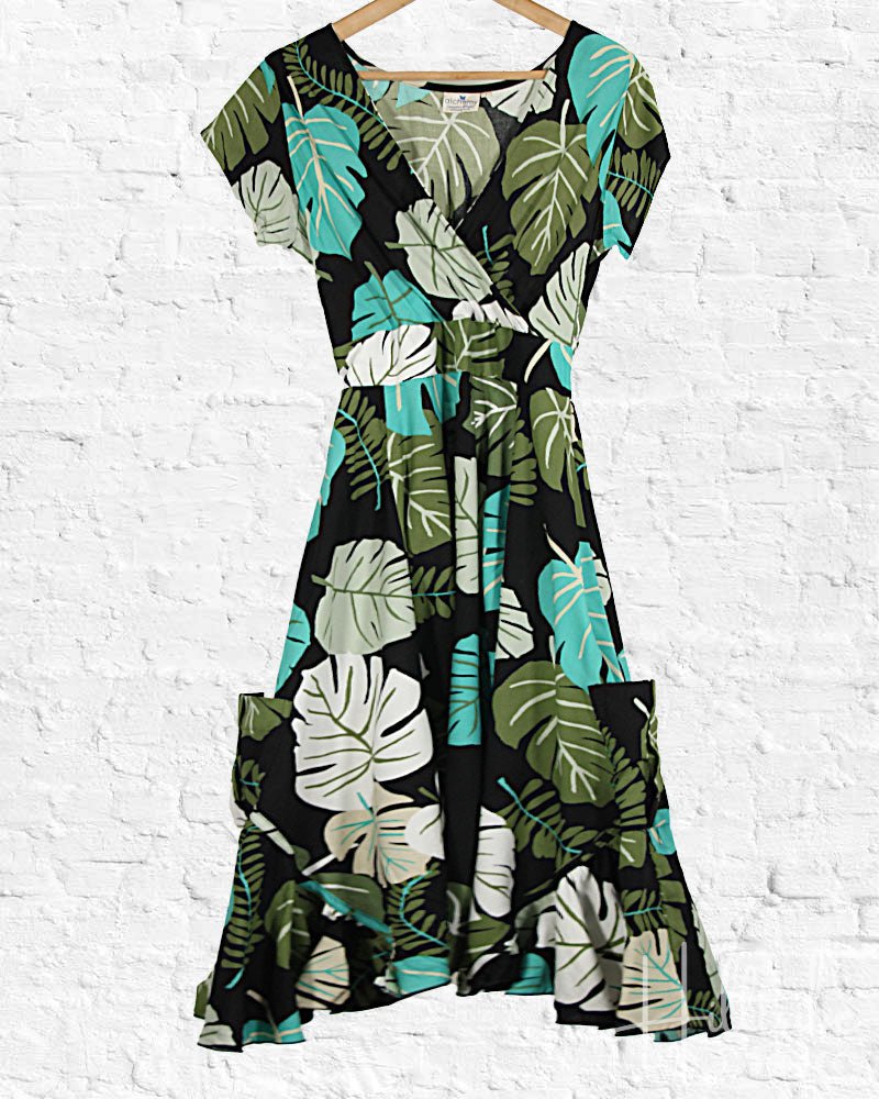 This dress is truly a customer favourite! Made in India with 100% natural rayon, this dress features a cross-front bodice and cap sleeves for a flattering fit. The elastic back and full, flirty skirt make it both comfortable and stylish, complete with patch pockets. Let this dress take you on a journey of love and relaxation.
