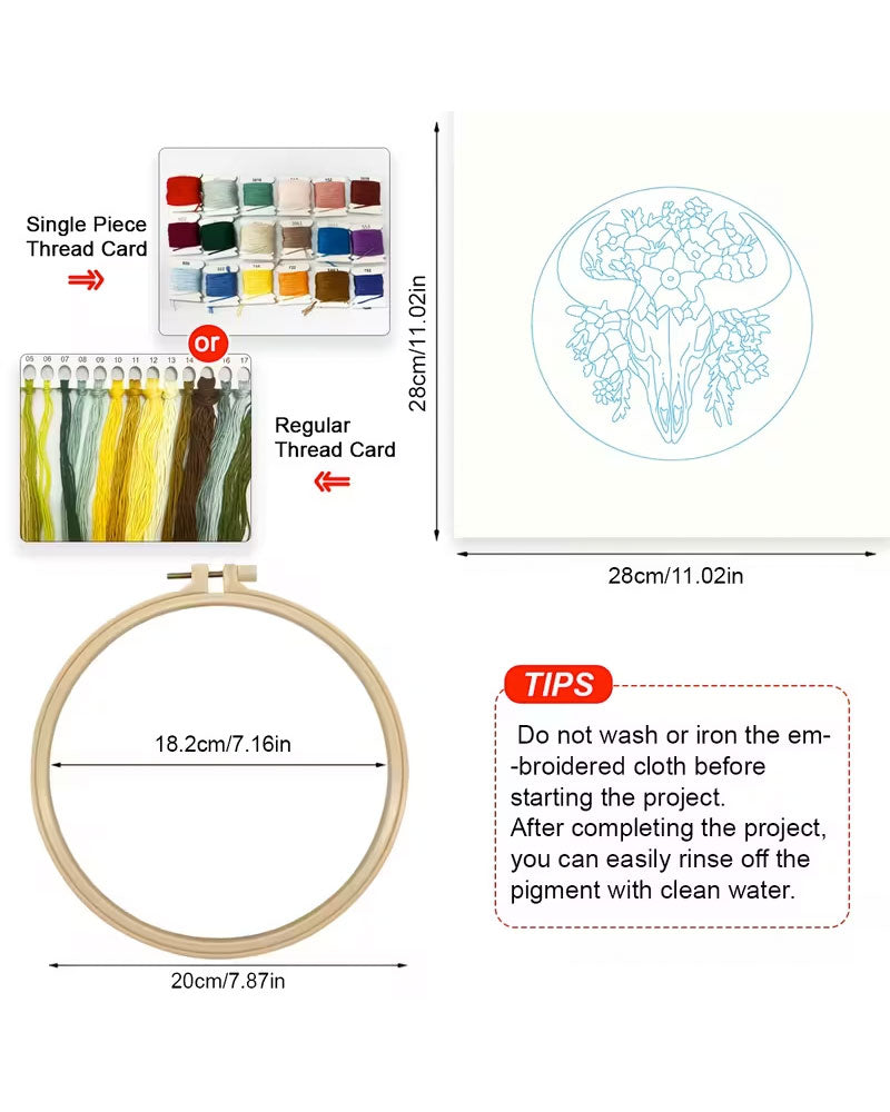 Unleash your inner artist with this fabulously fun Embroidery Kit featuring a striking Bull Skull surrounded by vibrant flowers! 🌼💀 Measuring in at a perfect 20x20cm (or 7.9x7.9 inches for those who love the classics), it's the ideal DIY project whether you're just starting out or you're already an embroidery whiz!