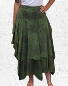 Indulge in the flowy, artistic, and ethically made Shasta Skirt. This statement piece effortlessly combines comfort with style. Meticulously crafted in Nepal from 100% cotton, its handkerchief hem adds graceful movement and a captivating boho flair. From a casual daytime look with a simple tank, to a festival-ready outfit with a cropped top and accessories, the Shasta Skirt exudes effortless bohemian charm. Created with slow fashion in mind, it's a timeless piece that celebrates individuality and sustainability.