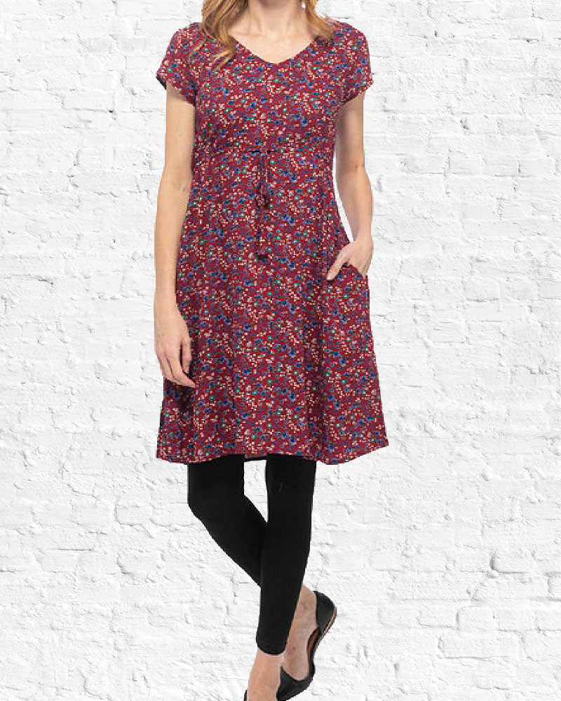 Our Robyn Dress is an absolute must-have! Crafted with luxe rayon fabric and featuring a gorgeous rounded-v neckline, cap sleeves, and side pockets, this dress is as comfortable as it is stylish. An easy-fitting A-line shape and drawstring front waist with an elastic back make this dress a perfect fit for any occasion! Who says you can't look good AND feel good?